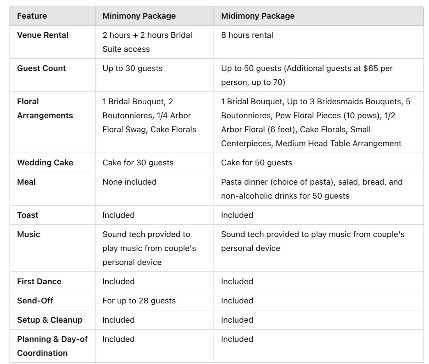 For couples who want a bit more space, a bit more time, and a bit more celebration, our Midimony Package offers the perfect balance of elegance and intimacy. This package includes everything you need for a memorable event with family and friends.